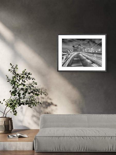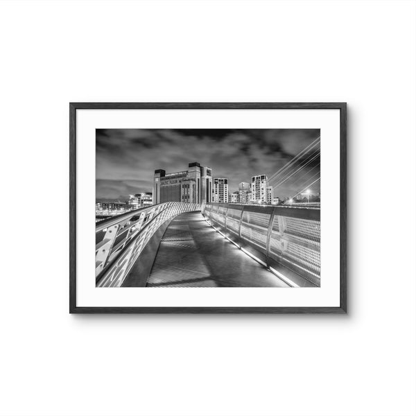 By removing colour, the image draws focus to the bold architectural lines of the Millennium Bridge and the industrial character of the Baltic. The monochrome treatment enhances texture, contrast, and form, creating a timeless interpretation of one of the North East’s most recognisable riverside scenes.