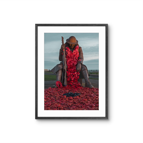 This close-up fine art photograph captures the emotional detail of the Tommy Sculpture, focusing on the cascading red poppies flowing from the seated soldier and pooling at his feet.
