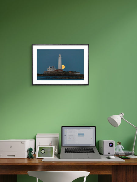 Bring the beauty of the Northumberland coast into your home with this striking fine art photograph. Featuring the Sturgeon Full Moon rising behind the iconic St Mary’s Lighthouse, this piece captures the drama of the night sky and the elegance of a historic landmark.