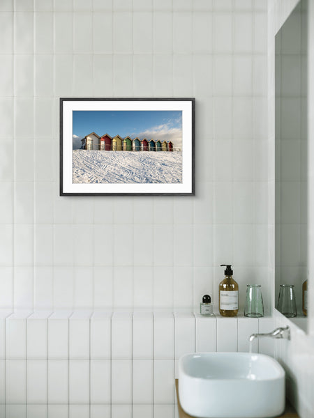 Blyth Beach Huts in Snow – Winter Coastal Photography Print